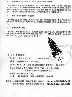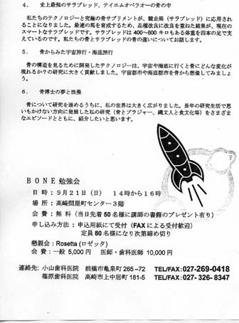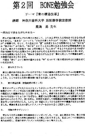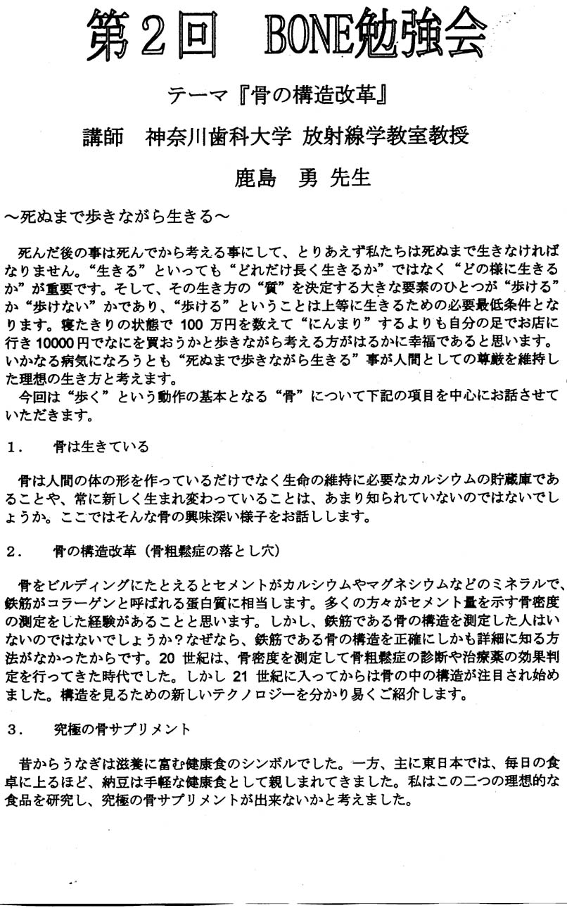 高崎市の篠原歯科医院 院長篠原先生を中心にスタディグループができました。医療の原点を忘れずに新たなる物が生まれる発信基地としての意味を持っています。「ボーン=BONE(骨)=BORN(生まれる)」と合わせました。第二回は神奈川歯科大学放射線学教授 鹿島 勇先生に講演していただきました。