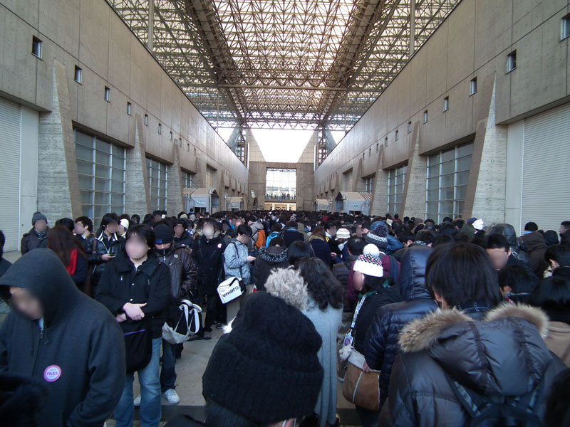 共同開催としては初めてという事で、今回は少し気合いを入れて参加してみようと思い、朝4時に家を出て開場へ8時前に着くよう出かけてみました。最近はtwitterで現地にいる人たちのつぶやきが見られるお陰で、今どんな状況なのかが分かって便利なのですが…まだ電車に乗って東京にすら入ってない朝6時の段階で既に200人くらい並んでるというツイートが…例年だと、朝8時頃に着いて300人くらい並んでいるのが相場なのに、何で今回は人が多いんだ?ここ最近だと、ProjectDIVA Arcadeの初お披露目の時が混雑すごかったけど、目玉になるゲームなんて出展予定あったかな…と少し疑心暗鬼になりながら開場へ向かいました。