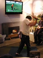 今回、テクモに行って初めてWiiをプレイしてきました。それは、スイングゴルフパンヤ2ndショット。家でネトゲのパンヤをやっているので、Wii版ってどんな感じなんだろうな〜って思ったのと、2ndになって声が入ったって事なので気になったから。ちょうどブースに行った時、10人くらいしか列ができてなかったので、少し待てばできるかな、と並んでみた。