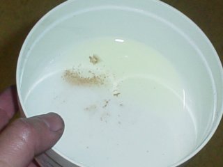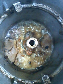 下図矢印が「Fuel Sedimentors」![]() 受け皿を用意し、下部のスクリュー・ドレインをひねって排出する。 こんな具合となる。 ![]() <セヂメンタの中・・・うえっ!>