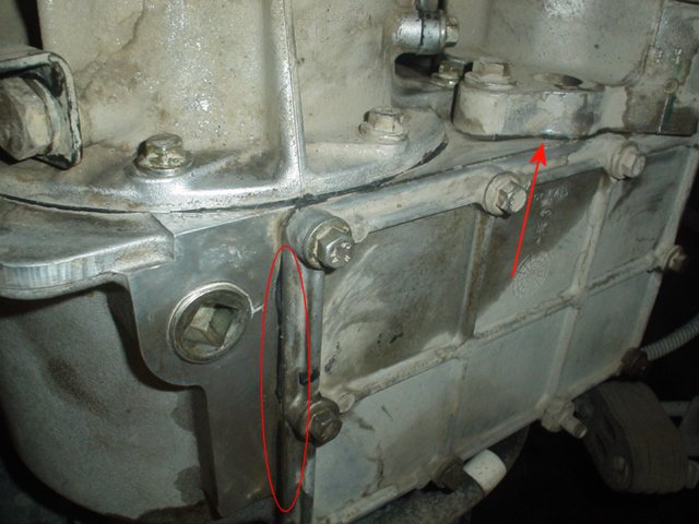 トランスファとミッションの継ぎ目あたりからのオイル漏れ。![]() ちょっと見た感じでは、トランスファ・ギアボックスのガスケット辺り(マル)から 漏れているように見える。 (私も一度、シールの貼り替えを行ったが、実際は違った) 実際は、ミッションからのメインシャフト入口にあるシールの劣化(矢印)。 |